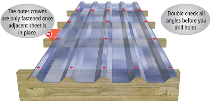 If there are ends laps (overlapping sheets generally required when covering large areas), these will be fixed at every crown. (Note: Do not fasten through the valley of the profile).